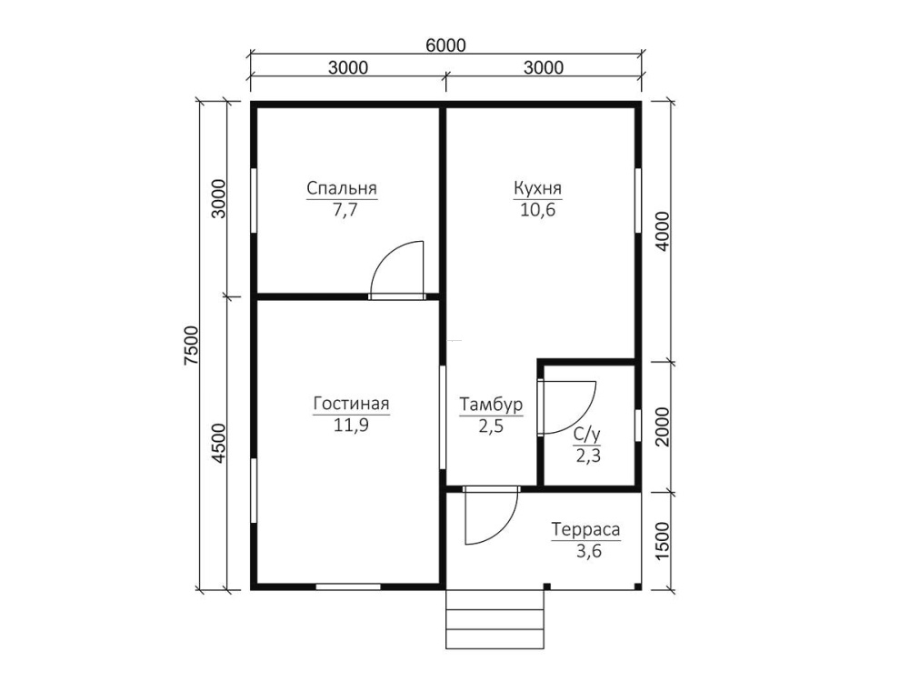 Проект 48 – одноэтажный дачный дом с пятном застройки 6х7,5 м., включая отмостку. При этом его полезная площадь составляет 38.6 кв.м..