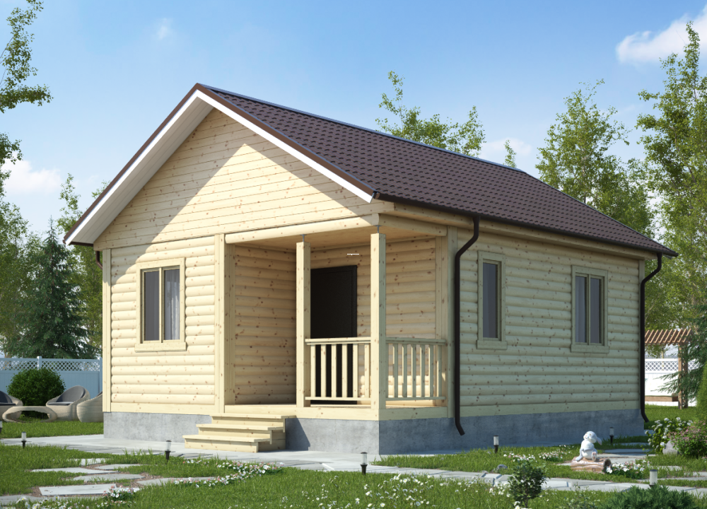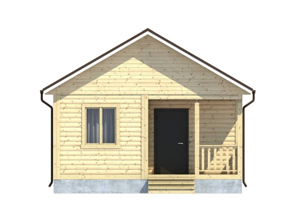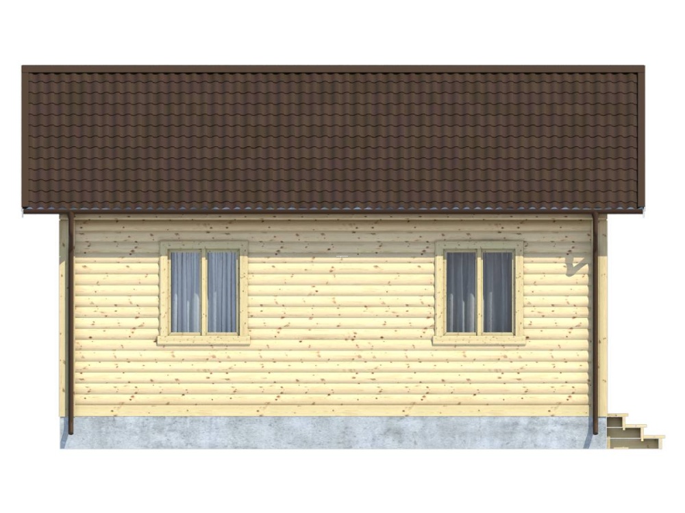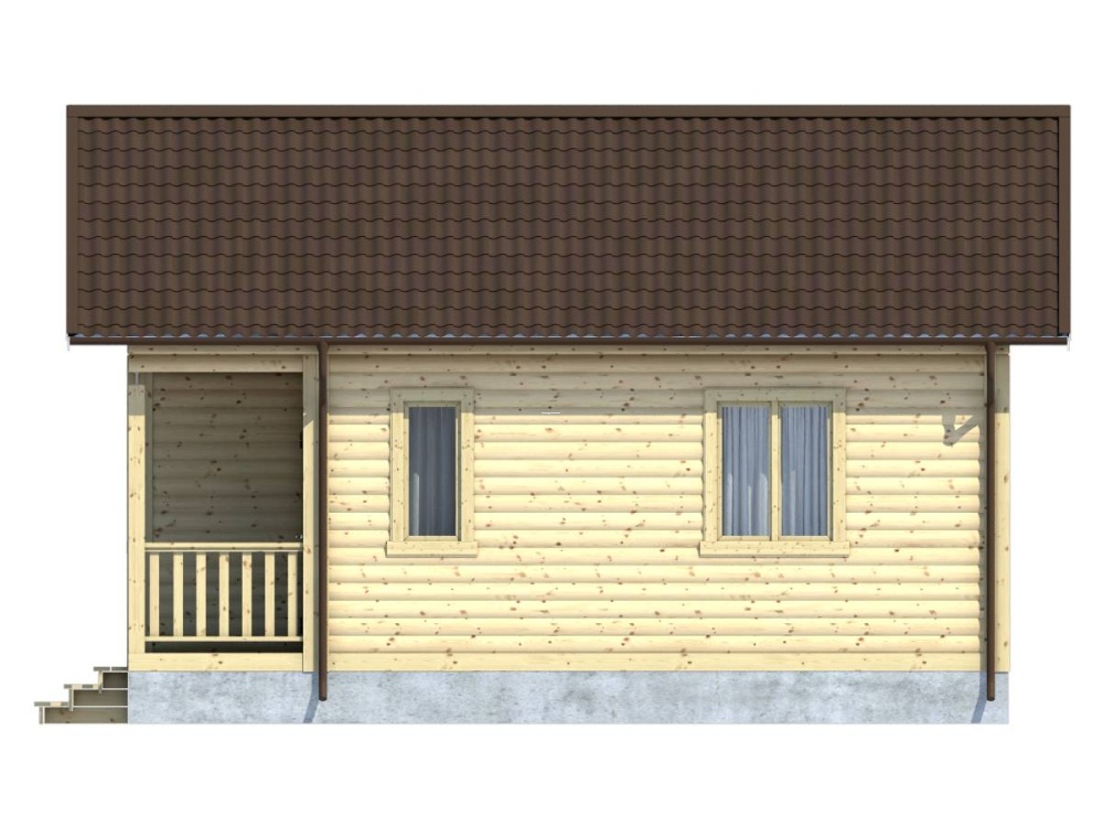 В проекте предусмотрена двускатная крыша из ондулина трех возможных цветов: красный, коричневый или зеленый. Дом с может изготавливаться в двух вариантах – летний, из профилированного бруса 90х140 мм, и всесезонный, с увеличенным до 140х140 мм сечением стенового материала. Для утепления между венцами из профилированных брусьев укладывается джутовое льнополотно. Два нижних ряда антисептированы.